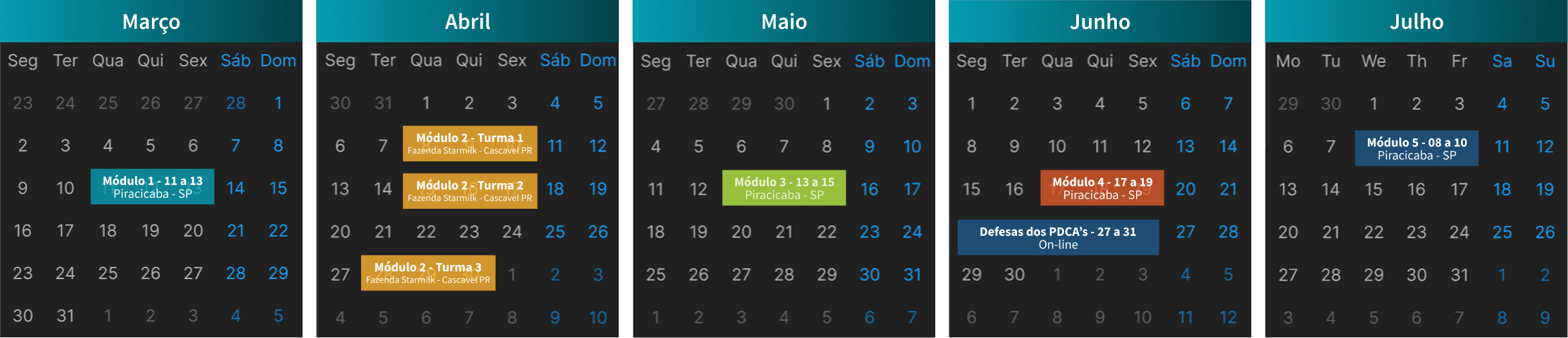 Módulo 2: No módulo 2 as aulas serão na Fazenda Starmilk, em Cascavel - PR. Devido às atividades práticas, a turma será dividida em 3 para este módulo.