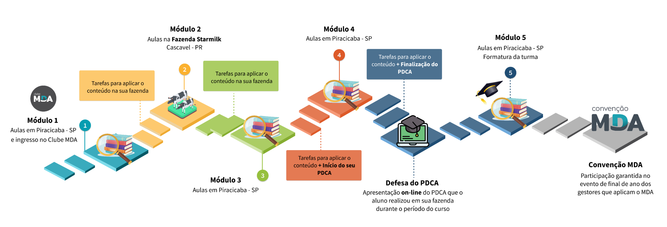 No novo formato da Formação MDA, o aluno participa de 5 módulos de aulas. Entre os módulos, sempre haverá atividades práticas para aplicação direta na fazenda, iniciando ou fortalecendo a implantação do Sistema MDA na sua realidade.